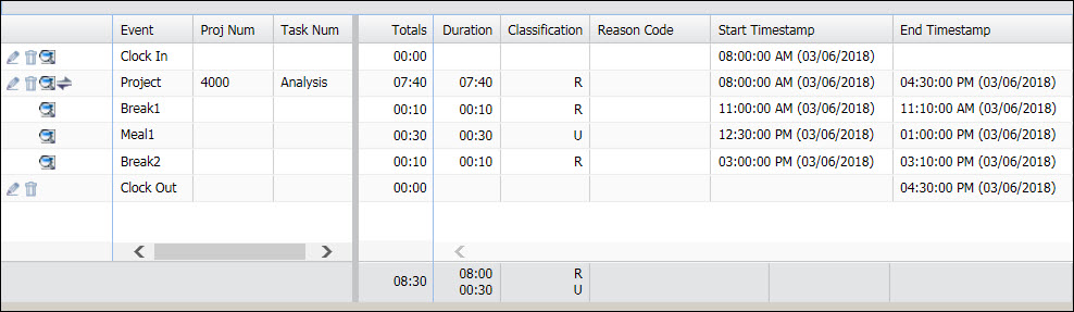 The employee is scheduled to work from 8 a.m. to 4:30 p.m. with a half-hour unpaid lunch and two paid 10-minute breaks. The break periods post automatically (the employee does not punch out for breaks).