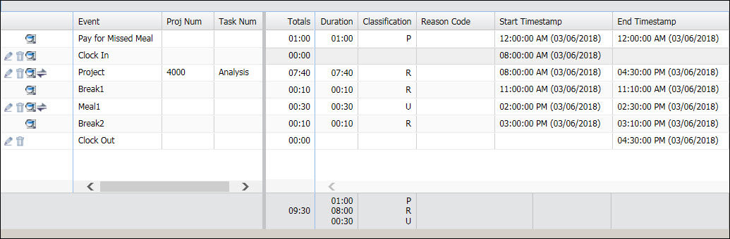The Pay Rules for the employee in these examples specify that the employee receives daily overtime after 8 hours. The "penalty" event that is posted for a missed meal will be classified as "P" and will not count toward overtime.