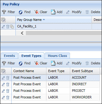 In this example, the minimum hours worked are configured in the employee's Pay Policy using the Event Types tab. The Account, Indirect, Project, and Work Order labor events count toward the minimum.