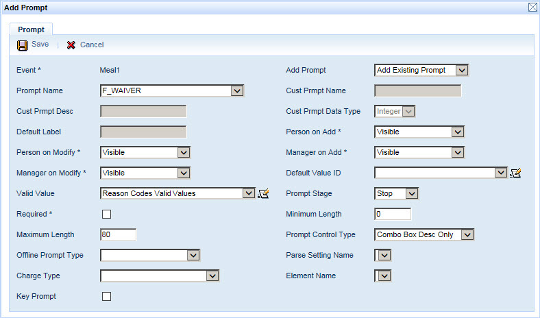 On the Prompt tab of the Events form, you will need to add the Penalty Waiver (F_WAIVER) prompt to the meal and break events. The Penalty Waiver prompt will allow the employee to waive the penalty pay when working through the meal or break. See Example 4.