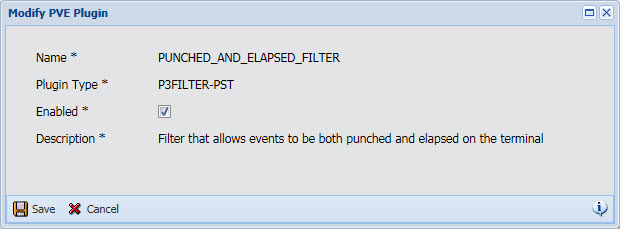 In addition, you must enable a PVE Plugin called PUNCH_AND_ELAPSED_FILTER. To enable this plugin, go to the PVE Plugin form (Main Menu > Configuration > System > PVE Plugin). Select the PUNCH_AND_ELAPSED_FILTER plugin, click Modify, and select the Enabled check box. Click Save.