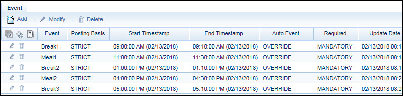 You will need to define a meal or break event for each automatic meal or break that will be posted in the employee's schedule. For example, if an employee has a 10-hour schedule, the employee will need two meal events – one that posts five hours after clock in and one that posts 10 hours after clock in. The employee will also need two break events – one that posts 4 hours after clock in and one that posts 8 hours after clock in.