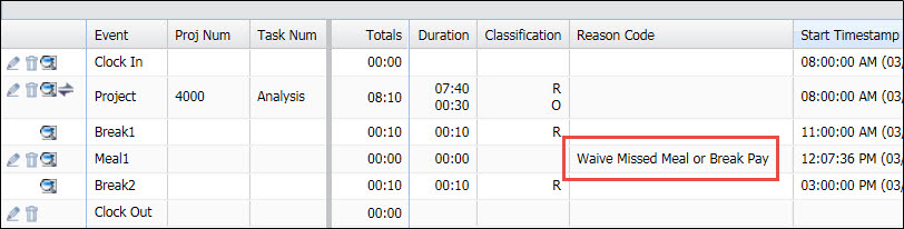 If the employer and employee both agree, an employee may work through a meal or break. To do so, the employee can punch a version of the meal or break event that has a zero duration; this event will override the automatic meal or break. The employee may also be authorized to waive the penalty pay for the zero-duration meal or break as shown in Example 4.
