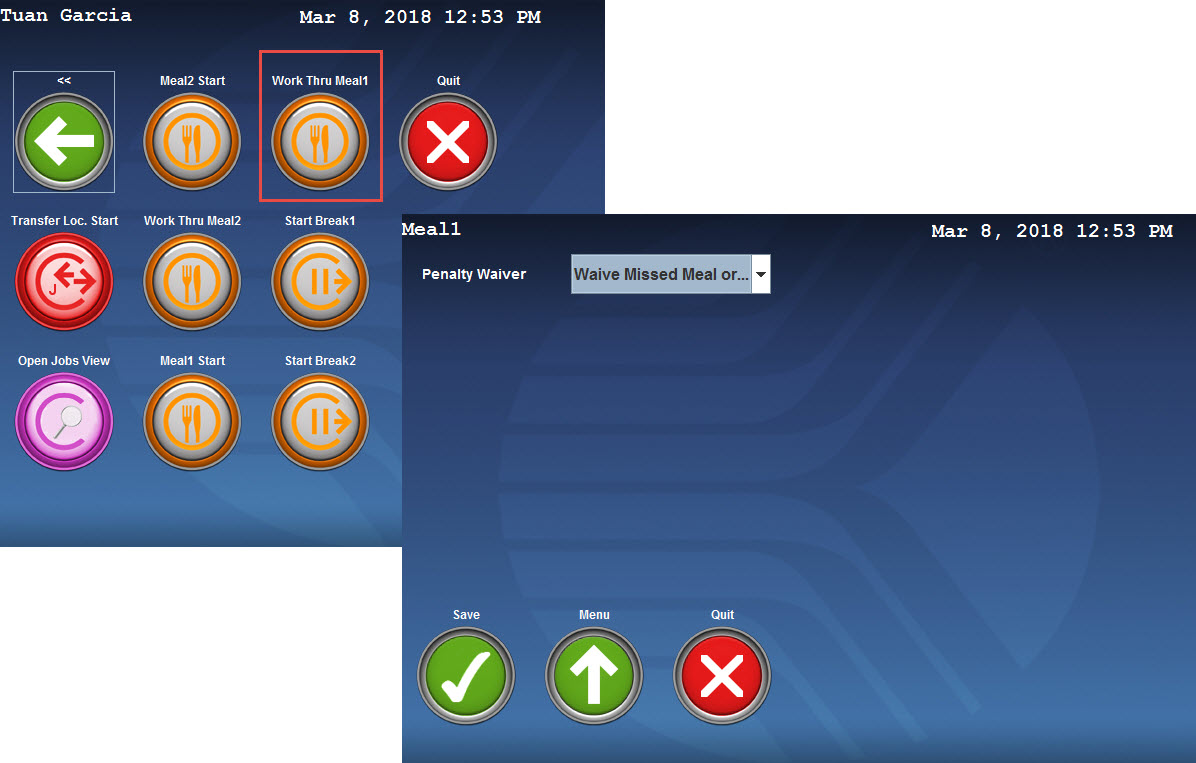 The employee punches the Work Thru Meal1 event at the terminal and for the Penalty Waiver prompt, the employee selects Waive Missed Meal or Break Pay.