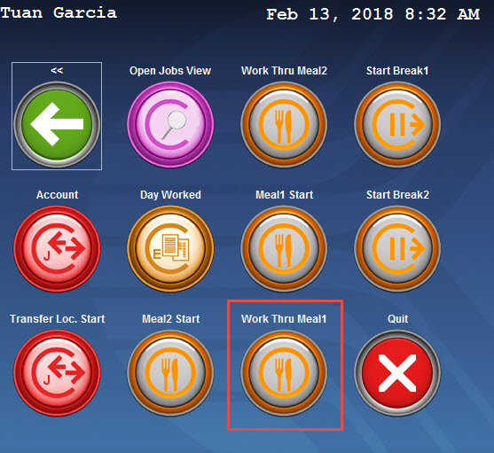 The supervisor asks the employee to work through lunch, so the employee punches the Work Thru Meal1 event at the terminal. This event posts a zero-duration lunch on the employee's timecard; see Create the Meal and Break Events for information on how to configure this event. The Work Thru Meal1 event overrides the employee's automatic lunch.