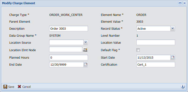 On the Charge Element form (Main Menu > Administration > Charge Element > Charge Element), select the charge element and click Modify. Enter the certification setting in the Certification field and click Save.