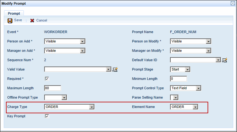 Prompt Name: Select the event prompt for the charge element that should be checked for certification. When a user enters a value for this event prompt, the system will check to see if that charge element requires certification. If the charge element does require certification, the system will then check to see if the person posting the event has the same certification as the charge element. For example, if Prompt Name is set to F_ORDER, when a user enters 3000 in the Order Num prompt, the system will check to see if Order 3000 requires certification. If Order 3000 does not require certification, the certification check ends. If Order 3000 requires certification, the system will check to see if the person posting the event has the same certification as Order 3000.