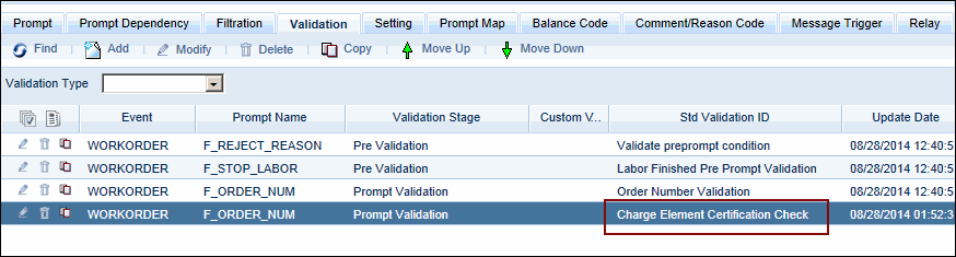 Use the Move Up and Move Down arrows to position the Certification Check under the charge element validation for the same Prompt Name.