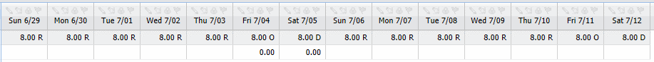 The illustration below shows how the timecard would look after the rule was applied. The employee has a bi-weekly pay period and works every day in the period. The pay rules also calculated Weekly overtime after 40 hours. Because the rule is Strict, the 7 consecutive days are not repeated.