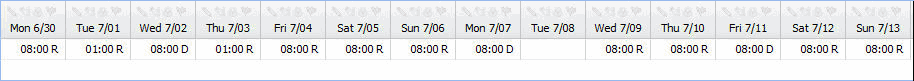 The illustration below shows how the timecard would look after the rule was applied. The employee has a bi-weekly pay period and works every day in the period. No hours were posted on 6/29. On 7/02, the employee has worked 3 consecutive days and therefore receives double-time for that day. The Cycle Size is 5 days, so the cycle ends on 7/04 and a new cycle begins on 7/05. On 7/07, the employee has worked 3 consecutive days in the new cycle, and so that entire day also receives double-time. Because the employee did not work on 7/08, the 5 day cycle is broken. A new cycle begins on 7/09 and on 7/11, the employee has again worked 3 consecutive days and receives double-time.