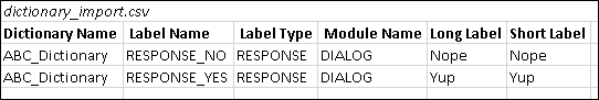 The Label Name in the dictionary import file must match an existing Dialog Element’s Label Name.