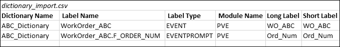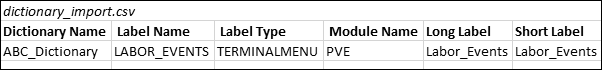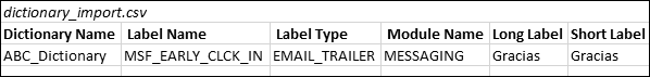 The following fields are required in a dictionary import: Dictionary Name, Module Name, Label Type, Label Name, Long Label, and Short Label. You can also include the following fields: Description, Locale, Base Dictionary, and Alternate Dictionary Name.