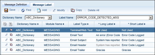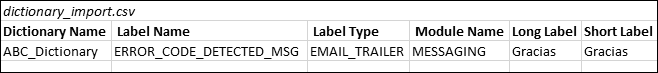 For Message Definition labels, the LABEL_NAME in the dictionary import file must match the Label Name of the Message Label.