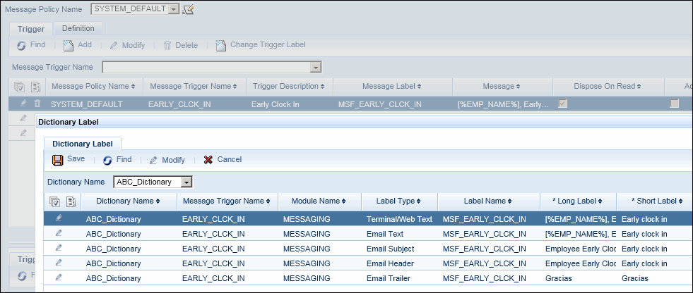 If you are updating a Long Label or Short Label that has semantics, you need to include the semantic in your new label. For example, the label [%EMP_NAME%], Early clock in displays a message in which the semantic [%EMP_NAME%] is replaced with the name of the employee. The label you are importing must also include the semantic [%EMP_NAME%] in order to display the employee’s name in the new message.
