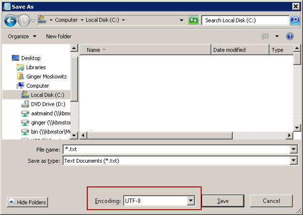 For example, if you are saving the dictionary import file in Notepad, you can select UTF-8 encoding in the Save As box.