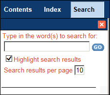 To search for a topic or term, click the Search button in the tool bar. Type a search term in the text box and click the magnifying glass to the right of the box, or press Enter. Any topics that contain the word you typed will display. To search for a phrase, enter it in quotes (e.g., "charge code").
