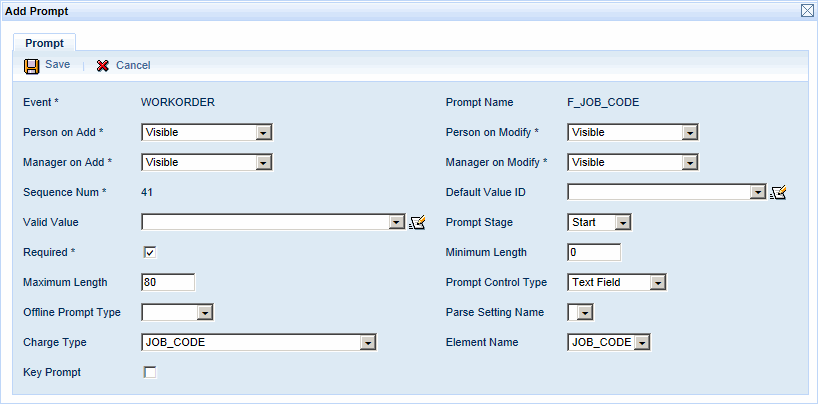 To add the Job Code prompt to an event, go to the Events form (Main Menu > Configuration > Event > Events). On the Prompt tab, click Add and select the F_JOB_CODE prompt.
