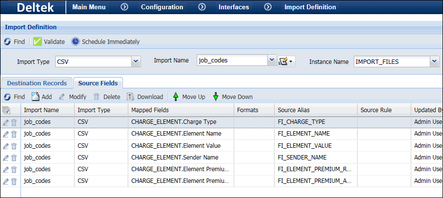 To import Job Codes, you need to define an Import Definition with the Charge Element context.