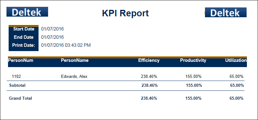 The KPI report displays Key Performance Indicators for one or more employees over a specified date range. These indicators measure the person’s Efficiency, Productivity, and Utilization.
