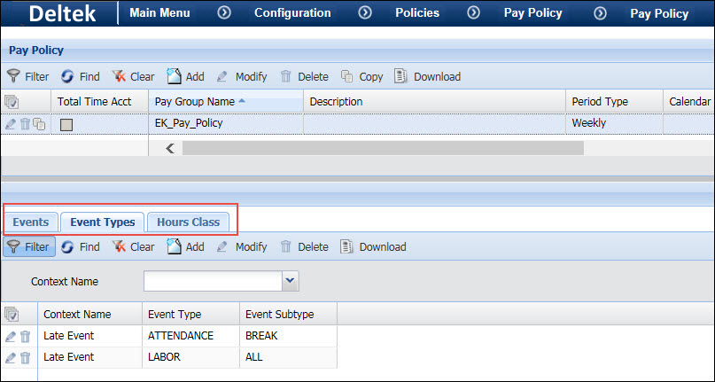 Use the Late Event context on these tabs to define the events and hours classes that count toward the minimum worked. For example, if you want all Labor and Break events to count, add these to the Event Types tab for the Pay Policy. You do not need to add anything to the Event tab. The Hours Class tab can also remain empty unless you want to specify which hours classifications to include.