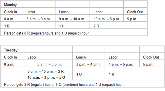 In the above example, the employee receives 5 Overtime hours for the time between the end of Monday’s lunch plus 24 hours (e.g., 10 a.m. Tuesday) and the start of Tuesday’s lunch (3 p.m.). The employee worked at least 8 hours of labor between the end of Monday’s lunch (10 a.m. Monday) and the start of Tuesday’s lunch (3 p.m.).