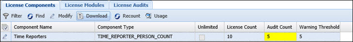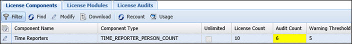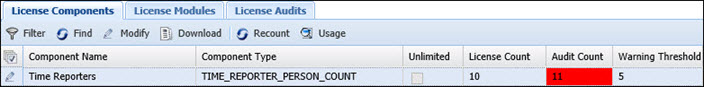 If a particular License Count changes (e.g., the number of active Time Reporters has changed), click the Recount button to update the License Count and Audit Count columns with the latest values.
