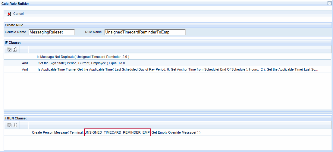 For example, the UnsignedTimecardReminderToEmp rule sends a message to employees before the pay period ends that they need to sign their timecards. In the Create Person Message operand for this rule, the Message Key parameter is UNSIGNED_TIMECARD_REMINDER_EMP.