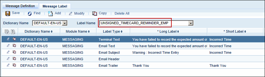 The Message Label tab on the Message Definition form is used to change the text of the messages generated from Messaging Rulesets and Message Definitions.