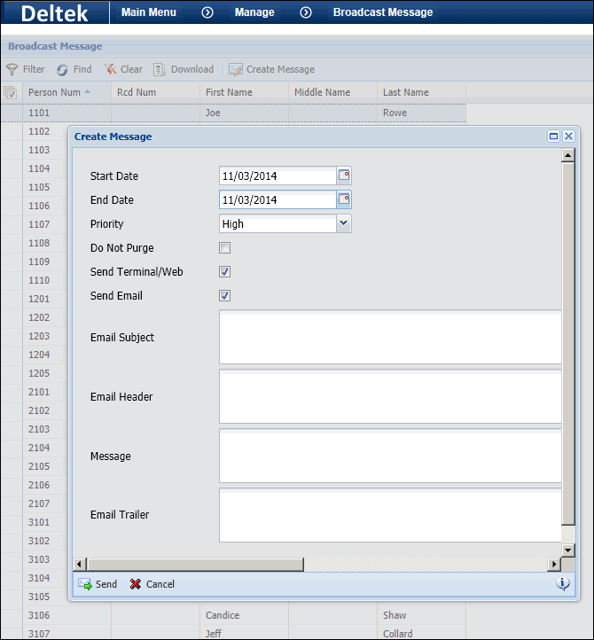 The Broadcast Message form is used to broadcast/send a message to one or more persons. These messages do not require Messaging Rules or Message Definitions. The supervisor composes a message on the Broadcast Message form and selects the persons who will receive the message. The message can be sent to the person’s email address or to display on a terminal or in the web application.