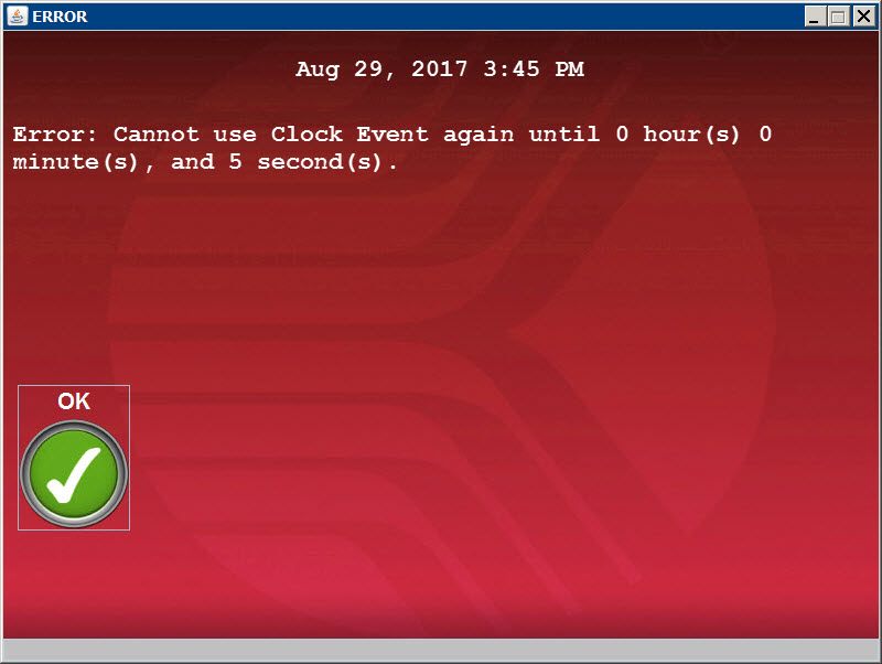 A user scans his badge to clock in and immediately (5 seconds later), scans his badge again to make sure he is clocked in. The terminal displays an error message that the CLOCK event cannot be used for another 5 seconds.