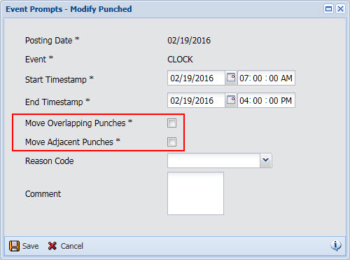 Example: Employee Clocks In at 7 AM and punches the following: Labor 1 starts at 7 AM and stops at 8 AM. Labor 2 starts at 8 AM. Supervisor adjusts the start of Labor 2 to 9 AM. If Move Adjacent Punches is checked, the stop of Labor 1 would also move to 9 AM. If Move Adjacent Punches is not checked, the stop of Labor 1 would not change and a gap event would post between the labors from 8 AM to 9 AM.