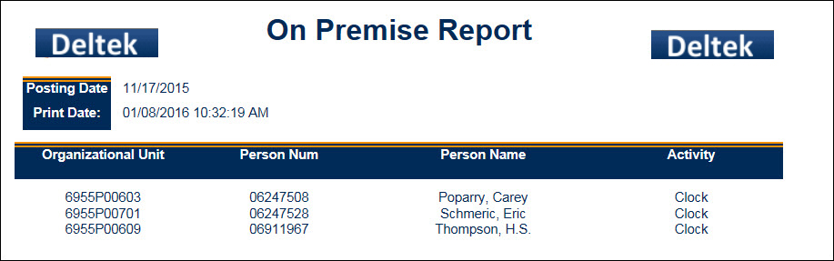 The On Premise Report allows supervisors to view information about current labor activities for employees that have clocked in during the given post date but have not yet clocked out.