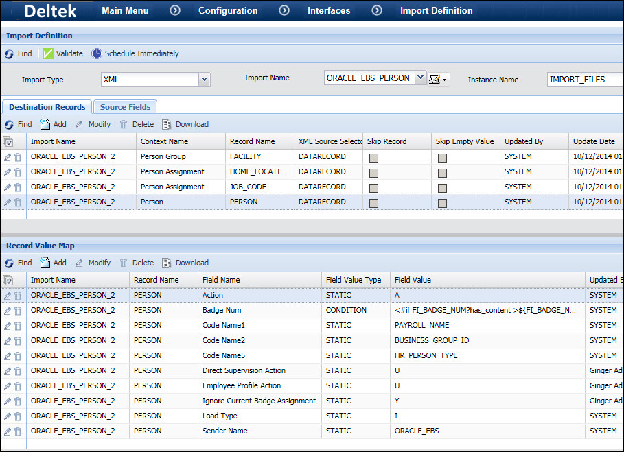 Use the settings explained below to ensure that the Employee Group Member, Employee Profile, and Badge records in your ORACLE_EBS_PERSON import will update existing records when appropriate.