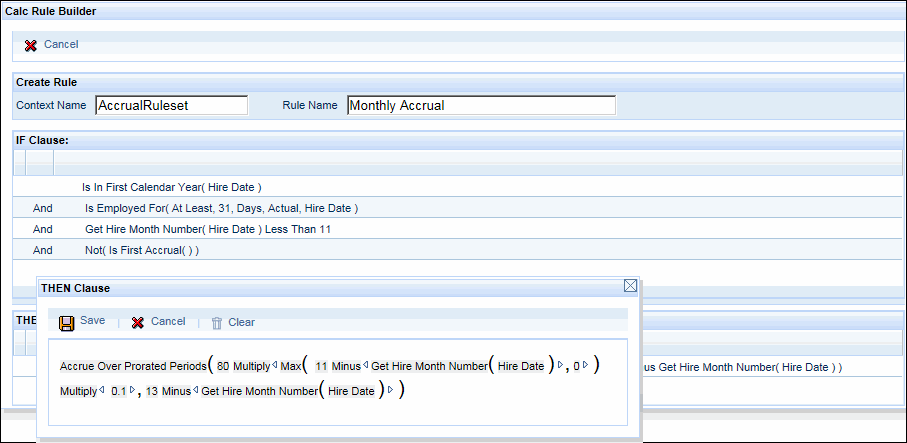 The rule’s IF clause defines what the first accrual is. It also defines that employees do not receive vacation time until after a 30-day probationary period, and that employees hired in month 11 or later (November or December) will not receive any vacation time that year. The THEN clause calculates the employee’s prorated vacation time based on the number of months since the hire date.