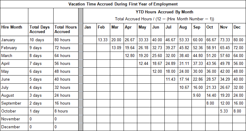 The table below shows the maximum hours an employee can accrue during the first year of employment. The total hours (and days) are shown as well as the year-to-date hours accrued each month. The monthly amount is obtained by dividing the Total Hours by (12 – (Hire Month Number – 1)).