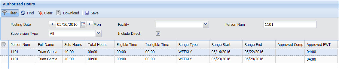 The Pay Policy that is in effect on the Posting Date will determine the number of records that display for an employee on the Authorized Hours form. For example, if Extra Work Time and Comp Time in the Pay Policy are set to Weekly, then two records will display on the Authorized Hours form (one for each week in the biweekly pay period).