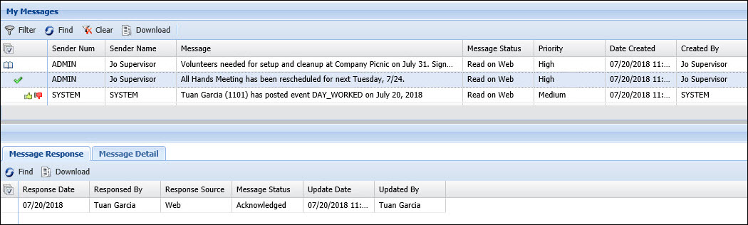 When you click the icon, the Message Response tab displays the new Message Status and the Update Date displays the current date and time. Each time you click the icon next to the message, a new record is created on the Message Response tab.