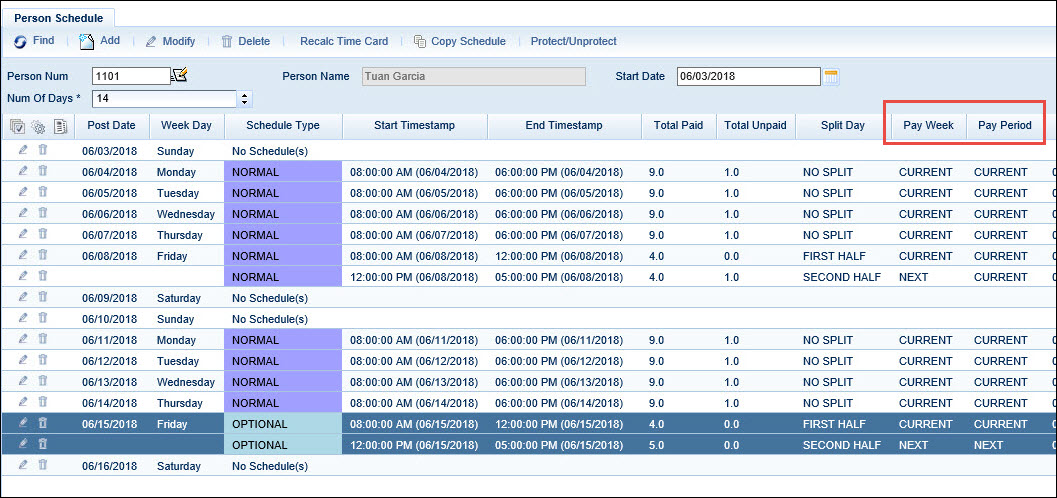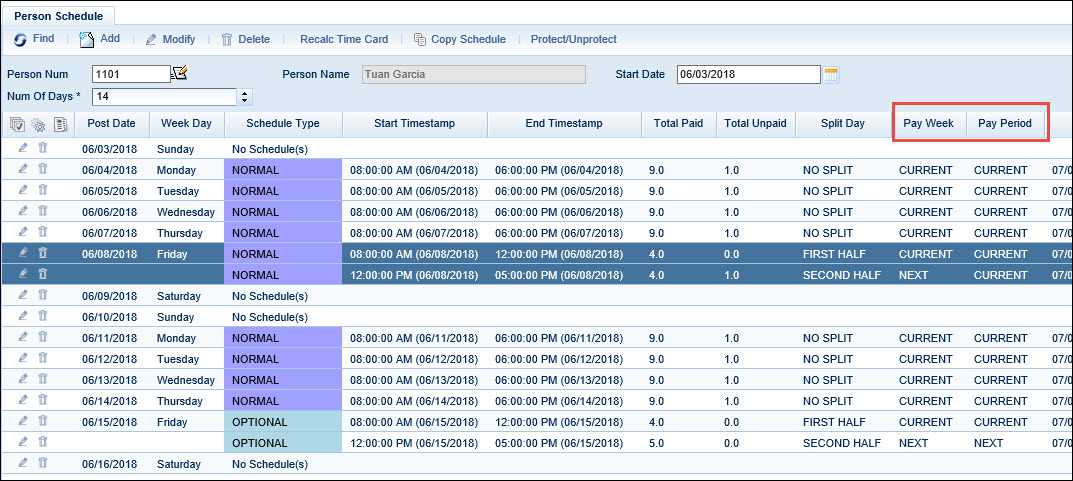 For example, in a 9-80 biweekly schedule, the last day in the period is a split Friday with an Optional schedule. For the First Half of this day, Pay Week and Pay Period are set to CURRENT. For the Second Half of this day, Pay Week and Pay Period are set to NEXT. If the employee works on this optional split day, the First Half will apply to the current pay period and pay week. The Second Half will apply to the next pay period and pay week.