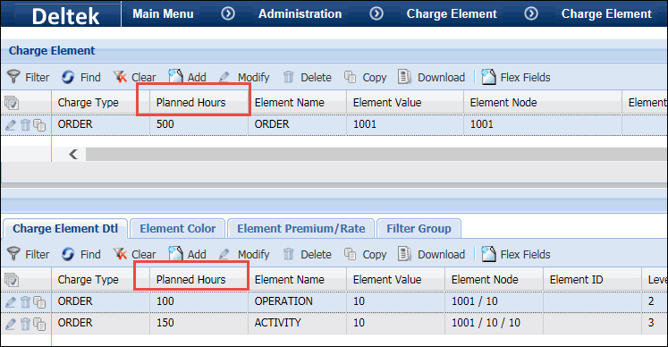 Planned Hours are defined for a particular charge element. The Charge Type Element form defines which level of the charge element will contain the Planned Hours.