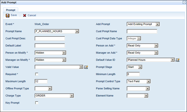 Click Save and repeat the steps above for the other event prompts you need to add (F_ACTUAL_HOURS, F_PLANNED_HOURS, or F_REMAINING_HOURS).