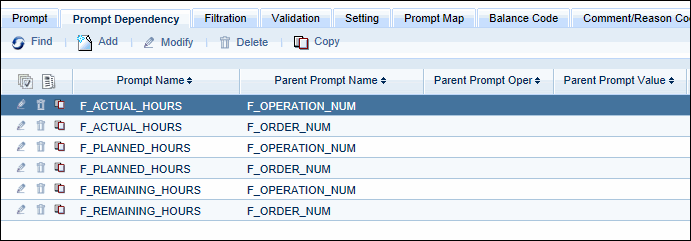 Select the correct Parent Prompt Name. For example, if Planned Hours will be calculated based on an Operation, then you need Prompt Dependency records for both F_OPERATION_NUM and F_ORDER_NUM.