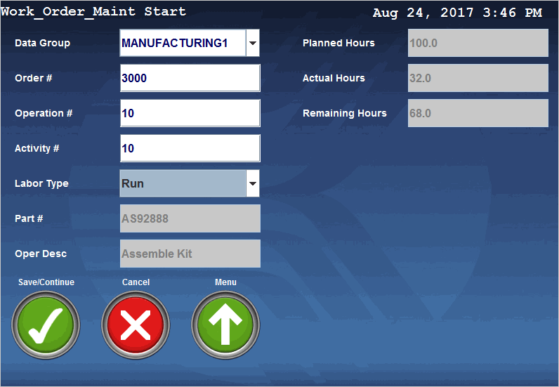 Shop Floor Time can be configured to display the planned, actual (consumed), and remaining hours for a particular job that a person is starting on a client terminal. This information will let the person know how many hours were planned (budgeted) for the job, how many hours have actually been worked, and how many hours remain. In addition, a supervisor can view the Open Labor hours (labor punches that are still open) for a particular job.