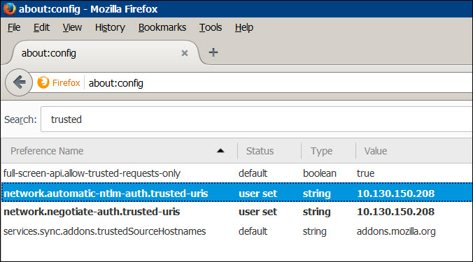9. If you are using Firefox as your web browser, you must also add the server name or IP address to the network.negotiate-auth.trusted-uris and network.automatic-ntlm-auth.trusted-uris settings in about:config.