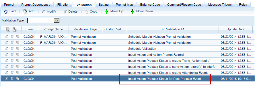 You must also add a validation to the Clock Out event that will trigger the Post Process Event rules. This validation is called Insert Action Process Status for Post Process Event. It is an Event Validation with the Validation Stage Post Validation. This validation needs to be the last validation for the event.