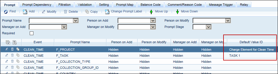If you want the event to be associated with a charge element, you must include this charge element as a hidden prompt on the event. Use the Default Value ID to assign the charge element.
