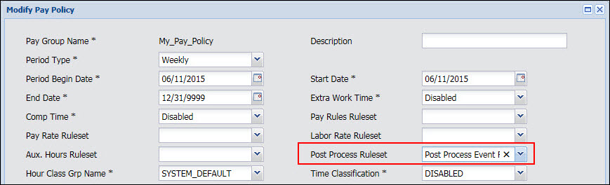 Finally, make sure you assign this ruleset to the Pay Policy of the employees who will be receiving the Post Process Event.