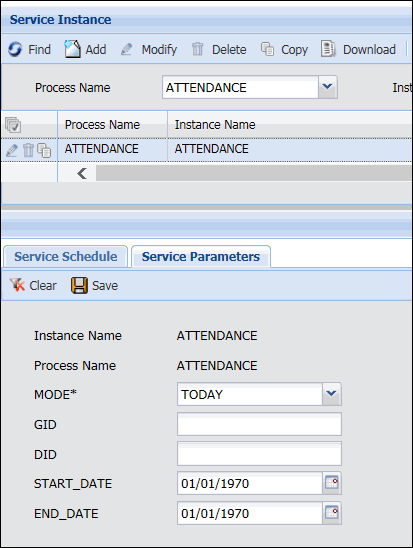 The Service Parameters tab on the Service Instance form is used to configure the values inside the actions that make up a service instance record. For example, you can use the ATTENDANCE service parameters to determine the range of days that the service will process.