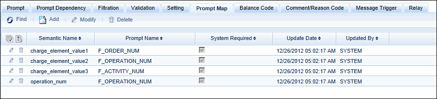 The event’s prompts for Order Number, Operation, Activity, Project Number, etc. must be mapped to a “charge_element_value” semantic. For example, if you have a Work Order event that prompts for Order Number and Operation, you need to map the F_ORDER_NUM and F_OPERATION_NUM prompts to the Semantic Names charge_element_value1 and charge_element_value_2.