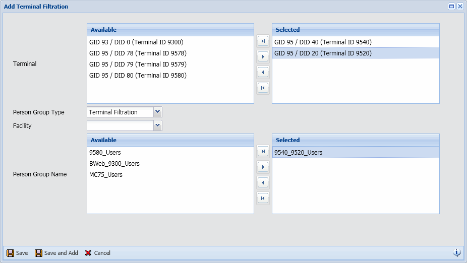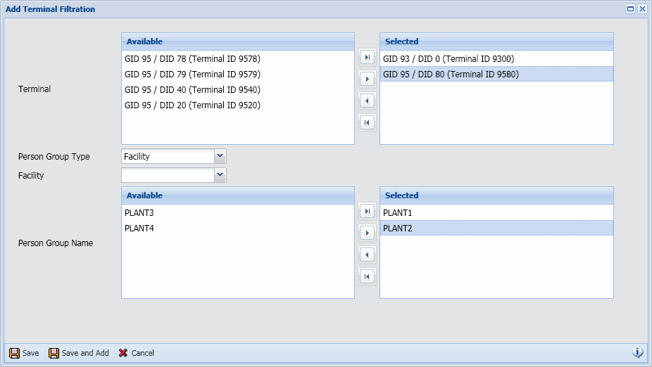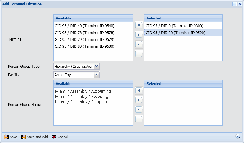 If you want to add more than one Terminal Filtration record, click Save and Add to save your settings and keep the Add Terminal Filtration window open. Or click Save to save your Terminal Filtration record and return to the main form.