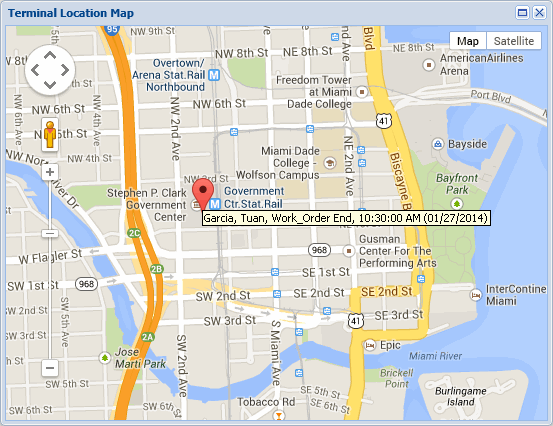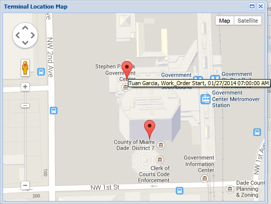 When you click the Map button next to the event in the timecard, the Terminal Location Map pop-up form will display.